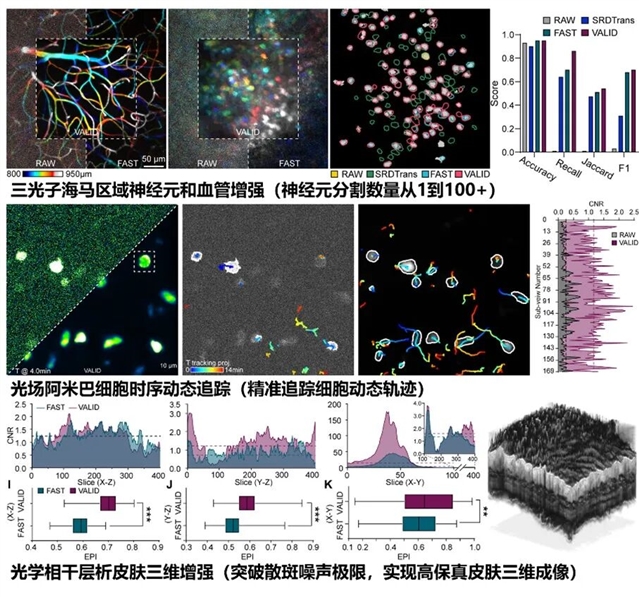 1、深层神经成像: 在双光子和三光子显微镜下,VALID成功将小鼠大脑深层(800-1100微米)的神经元和血管结构从淹没信号的噪声中“拯救”出来。实验显示,降噪后识别出的神经元数量从原始数据的1个激增至104个,信噪比提升了约10倍。