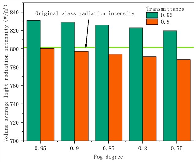 研究团队以实际电厂烟气 CO2微藻减排转化利用工程为原型,基于离散坐标辐射模型与计算流体力学(CFD)仿真,系统开展了反应器阵列光照分布与玻璃房温湿度调控研究。针对光照不足问题,团队创新设计了壁面与地面组合式反光挡板系统,通过优化挡板安装角度(北墙与东墙 35°、西墙与南地 0°),将反应器阵列整体光照辐射强度提升至 916.81 W/m²,较优化前提高 14.39%;同时,将顶部玻璃替换为高透光(95%)高雾度(95%)的散光材料,将直射太阳光转化为散射光,使藻液平均光照强度进一步提升 3.7%,有效改善了反应器内部及阵列间的光照均匀性。