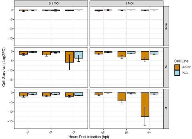通过细胞活力测定发现,无论感染野生型VSV还是M蛋白突变株(R1),PC3细胞的死亡率均低于LNCaP细胞(图1)。病毒滴度测定进一步证实,PC3细胞中VSV的复制效率远低于LNCaP细胞,表明病毒在PC3细胞中的生命周期受到限制(图2)。