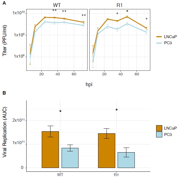 图2. 在相同的MOI下,LNCaP细胞比PC3细胞允许更多的病毒复制。(A)PC3和LNCaP细胞感染两种VSV毒株;(B)使用生长曲线的曲线下面积(AUC)进行直接比较。