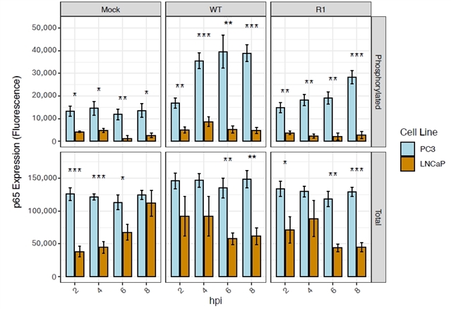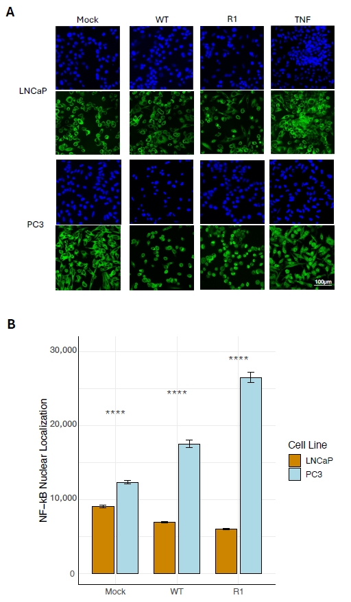 图3. PC3细胞表现出比LNCaP细胞更高的基线和VSV诱导的NF-κB 核定位水平。(A)PC3和LNCaP细胞中NF-κB 定位的免疫荧光(共焦显微镜)图像;(B)通过Image J中自动计数修正总细胞荧光(CTCF)来量化NF-κB 核定位。
