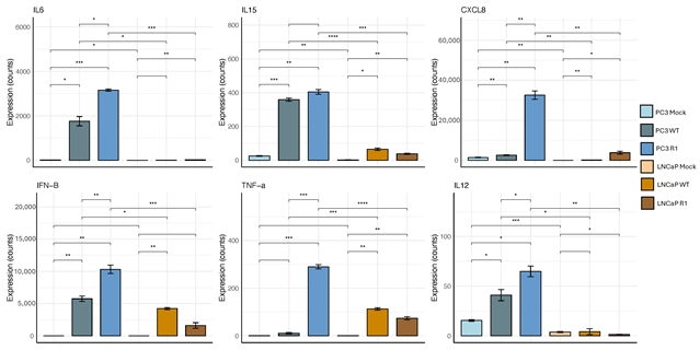 在感染VSV后,与LNCaP细胞相比,PC3细胞中所有测试的抗病毒/促炎基因(细胞因子IL 6、IL 12、IL 15、TNF-α、IFN-β和趋化因子CXCL 8)的表达水平都高得多。这表明VSV感染可进一步放大PC3细胞中已活化的NF-κB信号,强化其抗病毒状态(图6)。