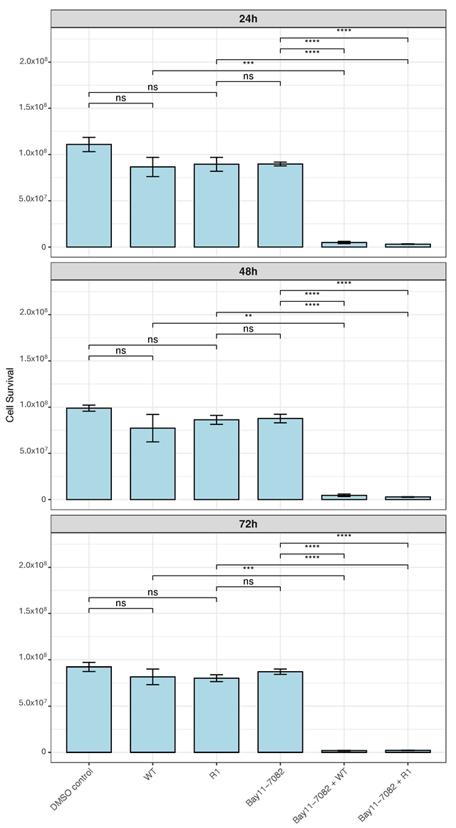 为验证NF-κB激活与VSV抵抗的直接因果关系,研究团队使用NF-κB特异性抑制剂Bay11-7082处理PC3细胞。单独使用抑制剂或单独感染VSV均未显著影响PC3细胞存活,但两者联合处理后,样本在所有测试时间点均表现出细胞死亡显著增加,表明协同作用。这一结果证实,阻断NF-κB通路能够有效逆转PC3细胞对VSV的抵抗性,使其恢复对溶瘤病毒的敏感性(图7)。