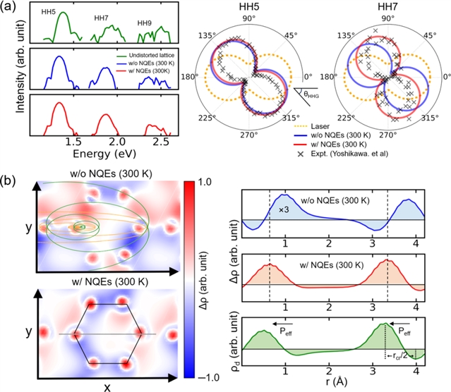 图 (a) 核量子效应调制的高次谐波谱及其椭圆偏振依赖。(b) 石墨烯晶格中核量子效应诱导的“电荷密度涟漪”。w/o NQE:不考虑核量子效应;w/ NQE: 考虑核量子效应。