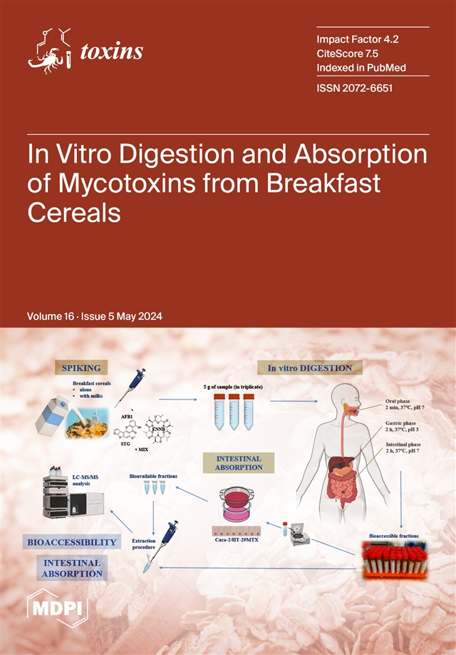 Sá, S.V.M.d.; Faria, M.A.; Fernandes, J.O.; Cunha, S.C. In Vitro Digestion and Intestinal Absorption of Mycotoxins Due to Exposure from Breakfast Cereals: Implications for Children’s Health.Toxins2024, 16, 205.https://doi.org/10.3390/toxins16050205