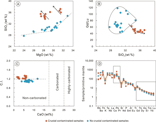 图1. 瓦房店地壳混染金伯利岩样品和未混染样品的SiO2vs MgO图解(A),Gd/Lu vs SiO2图解(B);地壳混染指数图解(C.I.)(C);和原始地幔标准化微量元素图解(D)。地壳混染样品表现出正SiO2和Pb异常以及升高的重稀土(HREE)含量。