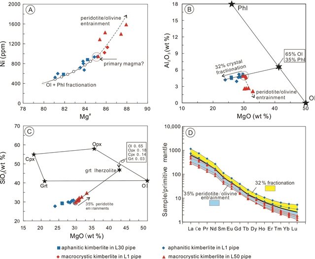 图2. 瓦房店金伯利岩Ni vs Mg指数图解(A)、Al2O3vs MgO 图解(B)、SiO2vs MgO图解(C)和稀土元素配分图(D)。隐晶质金伯利岩的成分变化表明这些岩石发生了最高达32%的橄榄石和金云母分离结晶作用,粗粒金伯利岩样品成分变化是由最高达35%的地幔橄榄岩捕获体引起。