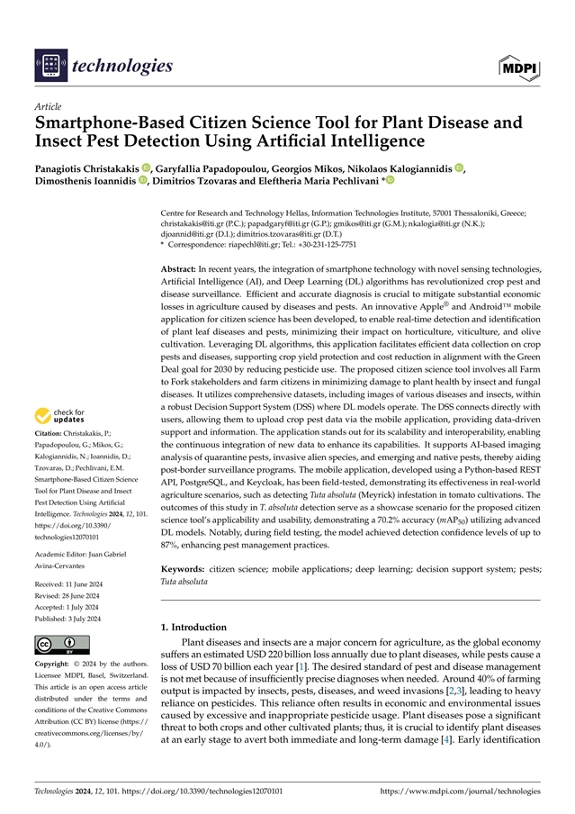 该文结合新型传感技术、人工智能和深度学习算法,开发出一款创新的 Apple® 和 Android™ 公民科学移动应用程序,能够实时检测和识别植物叶片病虫害,最大限度地减少其对园艺、葡萄栽培和橄榄种植的影响。