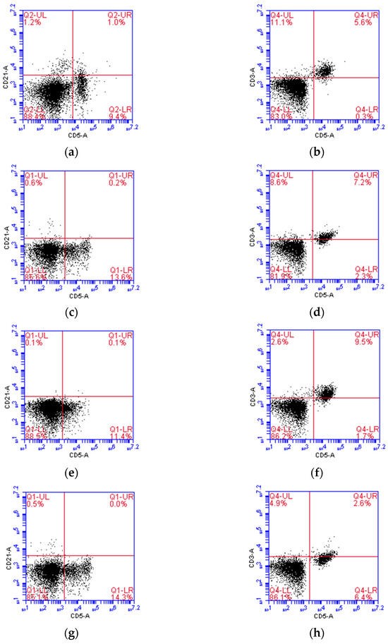 回输细胞以非B、非T细胞为主:供体1–4中,CD21-CD5-细胞占85.1%–88.5%,CD3-CD5-细胞占81.9%–86.2%。