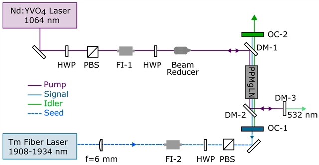 (3) 该方案为级联产生中红外激光提供了理想的窄带光源,有望用于泵浦砷化镓等非线性晶体以拓展至更长波长。