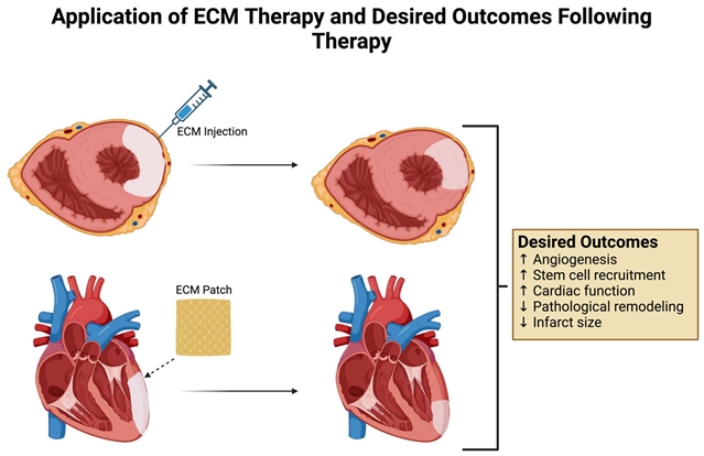 心肌组织中的细胞外基质(ECM)以胶原为主要成分,构建起复杂的三维网状结构,其心功能不仅是维持心脏的机械强度,更在心肌收缩力的传导、调控细胞间的旁分泌信号,以及维持局部营养供应和免疫稳态等多个层面发挥关键作用。心肌梗死发生后,ECM会经历炎症期、增殖期以及瘢痕形成期等一系列动态重塑过程,这一过程既是机体修复的重要基础,也可能导致不良心室重构,进而发展为心力衰竭。因此,围绕ECM进行干预,以促进有利修复、抑制病理性重构,逐渐成为心血管研究的重要方向。
