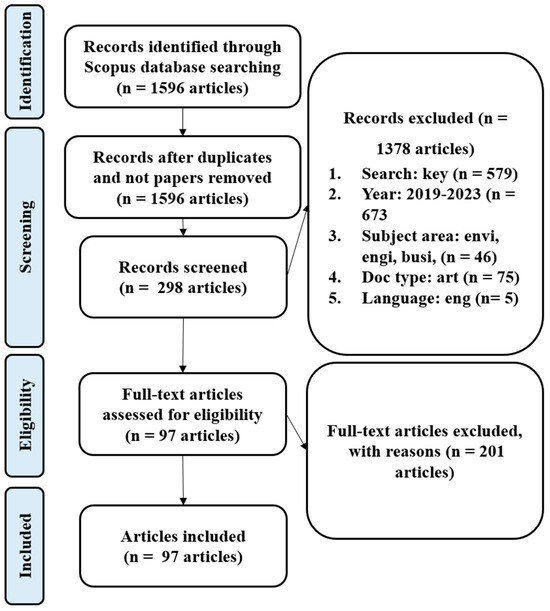 使用选定的术语"Industry 4.0" OR "Supply Chain" AND "CO2 reduction" OR "carbon footprint"在Scopus中搜索,初始得到1596篇文章。随后应用了6个过滤标准进行筛选,最终获得97篇符合条件的文章进行分析。