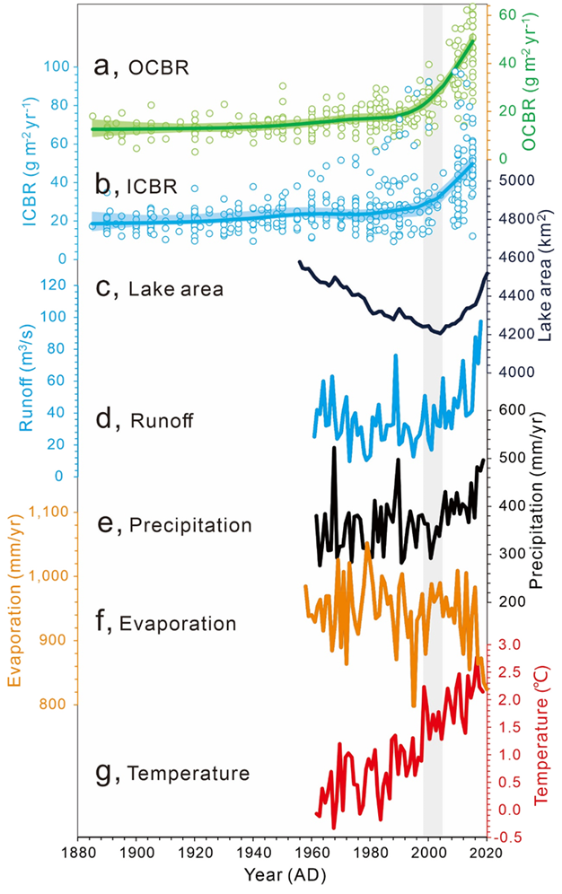 图1. 近百年青海湖内源无机碳埋藏速率变化及其驱动因素