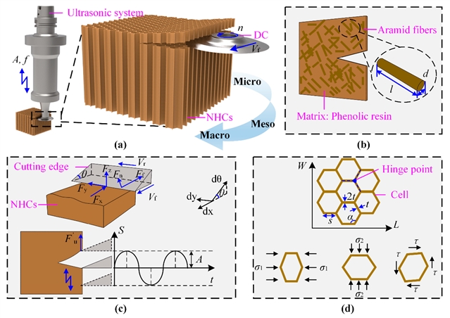 图1. Nomex蜂窝复合材料的多尺度分析:(a)超声振动辅助切削过程示意图;(b)微观尺度展示纤维-基体形态;(c)宏观尺度展示在超声振动下的力学分析和间歇切削行为;(d)介观尺度展示蜂窝孔格单元的变形。