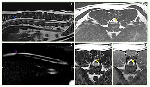 病例特征显示,法国斗牛犬(4例)和巴哥犬(3例)最为常见,提示遗传因素。病变部位与品种相关:罗威纳犬多见于颅颈段,小型犬多见于胸腰段(T7-L1)。典型MRI表现为蛛网膜下腔梭形扩张,部分病例并发椎间盘突出或椎体畸形。影像学检查在巴哥犬中还发现尾关节突发育不良。