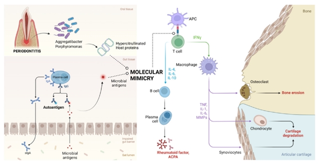 口腔 - 肠道 - 肌肉骨骼轴对类风湿关节炎病理生理学影响的机制。导致牙周炎的口腔致病菌,如聚集杆菌属和卟啉单胞菌属,会产生与宿主抗原具有分子模拟性的高瓜氨酸化蛋白,从而促进类风湿关节炎的发病。同样,肠道菌群失调会导致病原微生物抗原进入,然后被管腔浆细胞呈递,这些浆细胞也与宿主抗原具有分子模拟性,从而破坏关节,正如在类风湿关节炎中所观察到的那样(抗瓜氨酸化蛋白抗体:抗瓜氨酸化蛋白抗体;抗原呈递细胞:抗原呈递细胞)。