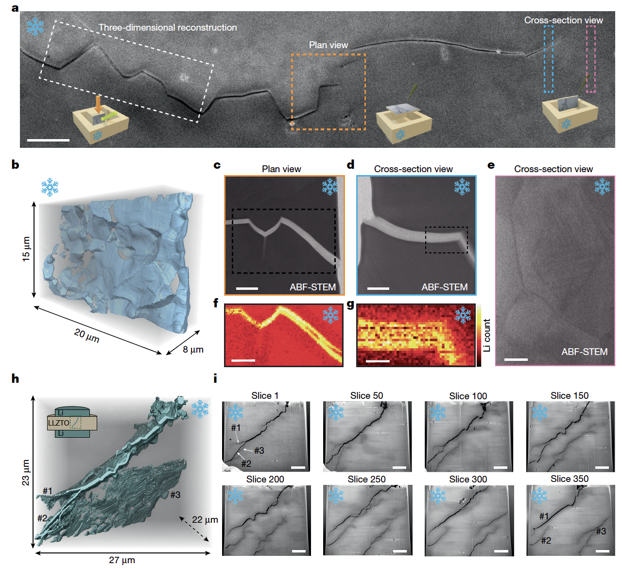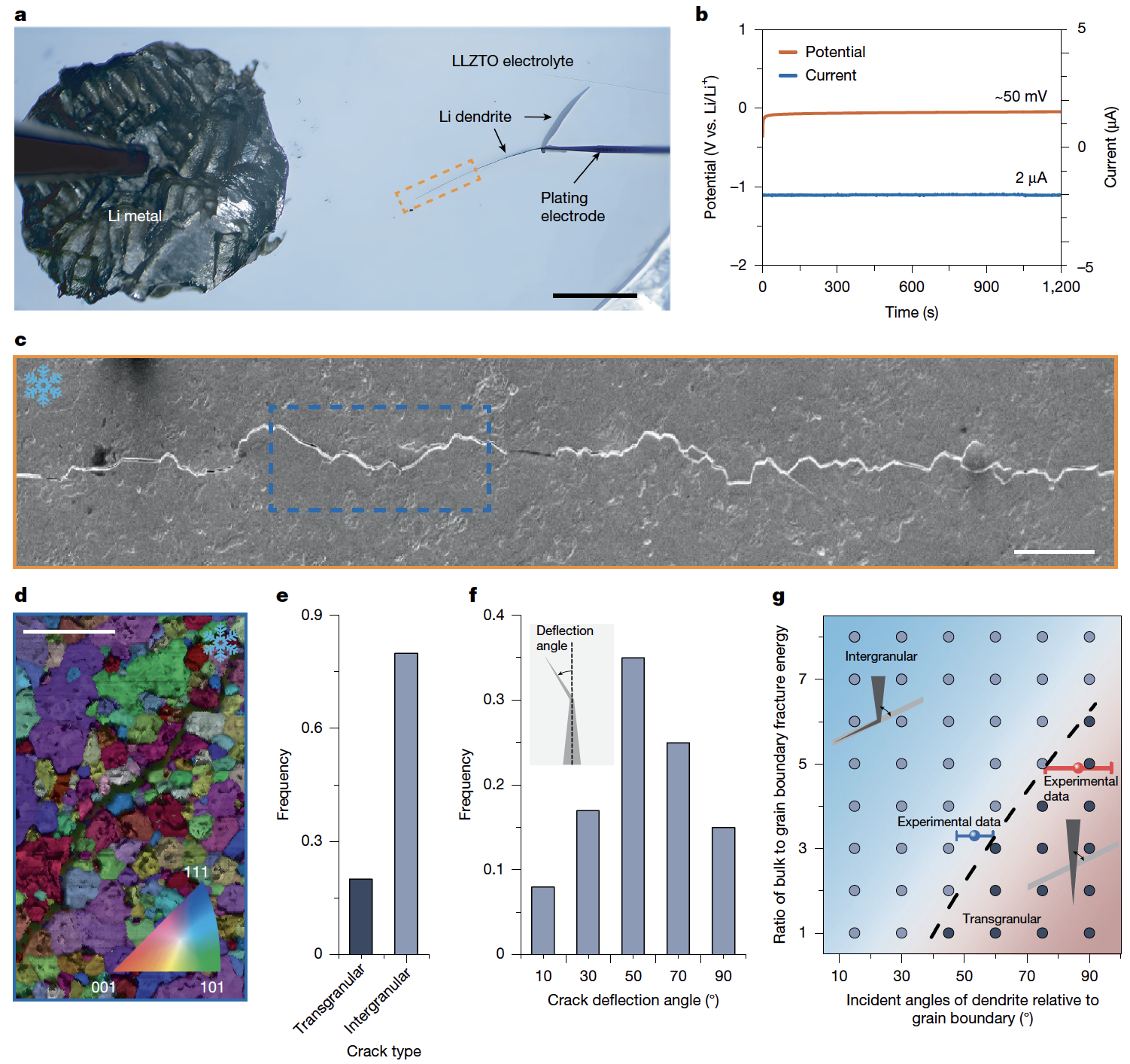 研究团队发展了可精确定位锂枝晶尖端位置的平面型电池装置,开发了基于原位工况光镜、冷冻扫描电镜、冷冻透射电镜及电子能量损失谱的辐照敏感材料先进表征技术,研究了纳米、微米和宏观尺度下固态电解质中锂枝晶的生长行为以及多场耦合下固态电池的失效机制。发现锂枝晶生长宏观上呈近似直线扩展行为,而在微观尺度上表现为穿晶和沿晶混合断裂模式,其中约20%为穿晶断裂,说明锂枝晶的生长并非源于晶界处锂的孤立还原析出和互连。此外,近75%的沿晶裂纹偏转角超过40°,表明即使较大的裂纹偏转亦可显著降低枝晶尖端的最大拉应力,锂枝晶仍倾向于沿晶界连续生长。