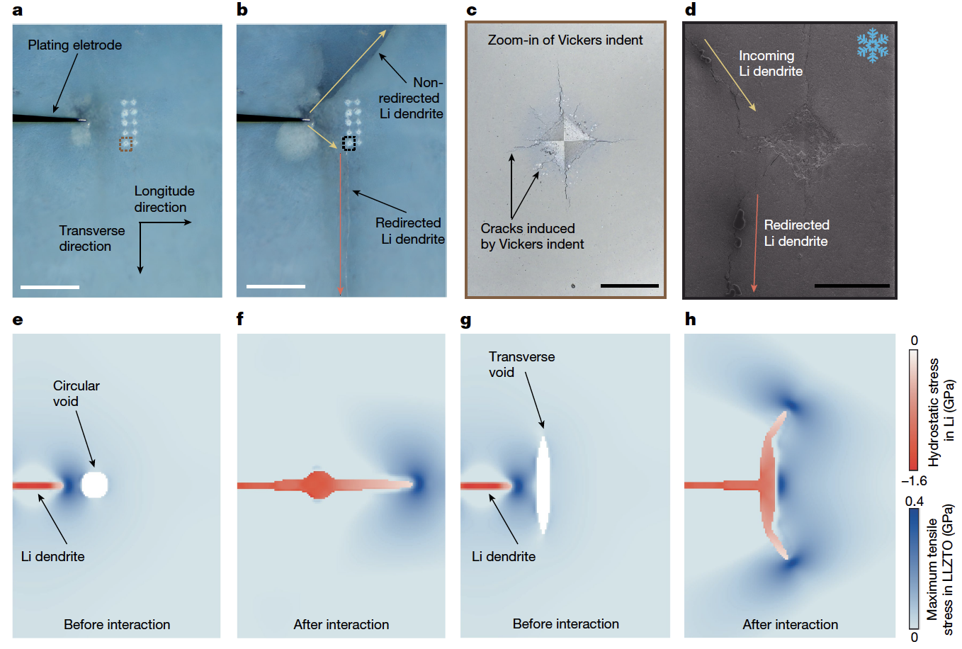 2026年4月22日,上海交通大学轻合金精密成型国家工程研究中心丁文江院士团队董杰教授课题组刘传来副教授、德国马克斯-普朗克可持续性材料研究所Yuwei Zhang博士、Siyuan Zhang博士和Gerhard Dehm教授合作在Nature期刊在线发表题为“Mechanically driven Li dendrite penetration in garnet solid electrolyte”的研究论文。该研究针对全固态锂金属电池中枝晶生长导致电池短路失效的难题,首次从纳米到微米尺度揭示了锂枝晶在固态电解质中的应力驱动生长机制,提出通过微孔洞等结构缺陷定向调控枝晶生长路径,大幅提升了固态电池循环稳定性,对实现下一代高能量密度、高安全、长寿命全固态锂电池具有重要的指导意义。