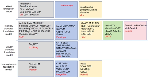 图2.最新的基础模型(里程碑式模型以红色标标注)