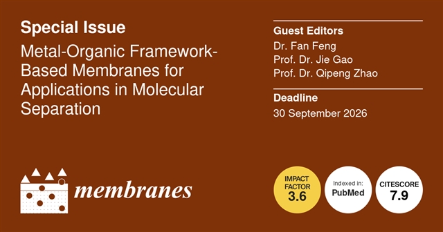 Membranes邀请了新加坡南洋理工大学冯帆博士,中国科学院宁波材料技术与工程研究所高洁研究员和同济大学环境科学与工程学院赵祺鹏研究员,合作建设特刊Metal-Organic Framework-Based Membranes for Applications in Molecular Separation(金属有机框架基膜在分子分离中的应用)。这个特刊旨在重点介绍近年来金属有机框架(MOF)新型膜的研究进展,包括MOF的制备及其在膜中的应用;MOF集成膜的污染控制策略;以及膜的理化性质、分离性能和耐久性表征。研究领域可涵盖(但不限于)以下方面: