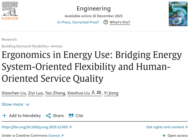 该研究于2025年12月10日以“能源使用人因工程学:连接面向能源系统的柔性与面向人的服务质量”(Ergonomics in Energy Use: Bridging Energy System-Oriented Flexibility and Human-Oriented Service Quality)为题发表在《Engineering》。清华大学建筑学院助理教授刘效辰为论文第一作者,刘晓华教授为通讯作者,论文共同作者包括江亿院士、张涛副研究员和博士研究生罗紫怡。本研究得到了国家自然科学基金、中国科协青年人才托举工程的资助。