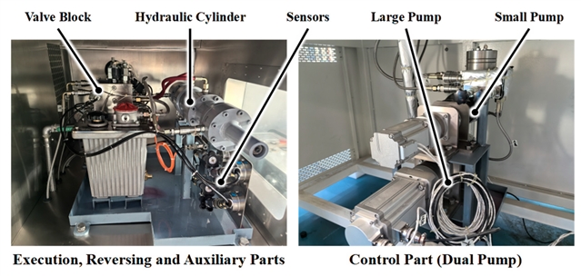 为验证所提出的“双泵-单缸”架构及自适应补偿算法的有效性,本文搭建了专门的液压实验台进行测试,并与传统单泵方案进行了对比。