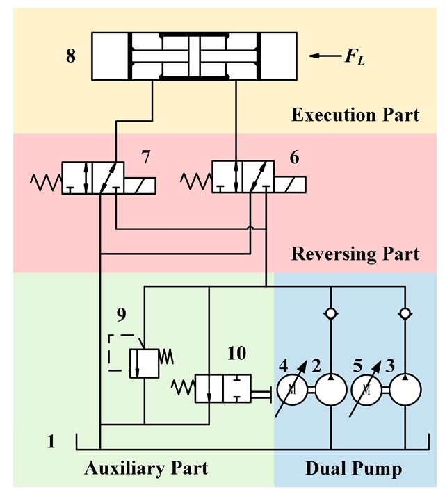 图1. 推进油缸液压系统图。1.油箱;2.大排量泵(主泵);3.小排量泵(辅助泵);4.电机1;5.电机2;6.二/三通换向阀1;7.二/三通换向阀2;8.液压缸;9.溢流阀;10.手动卸荷阀。