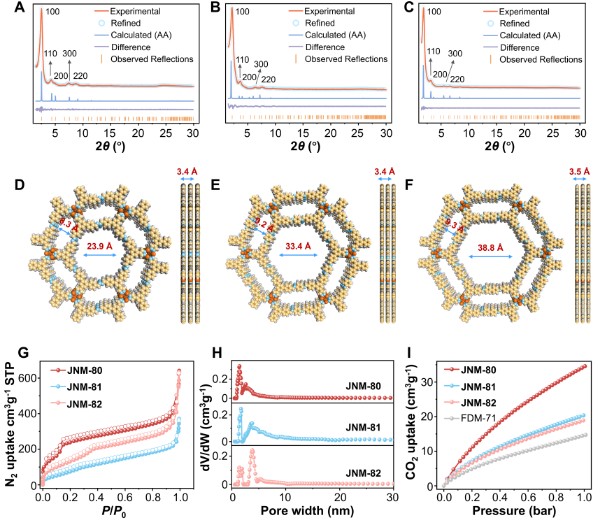 图2:异孔CMOF的晶体结构模拟,比表面积和孔径分布表征。