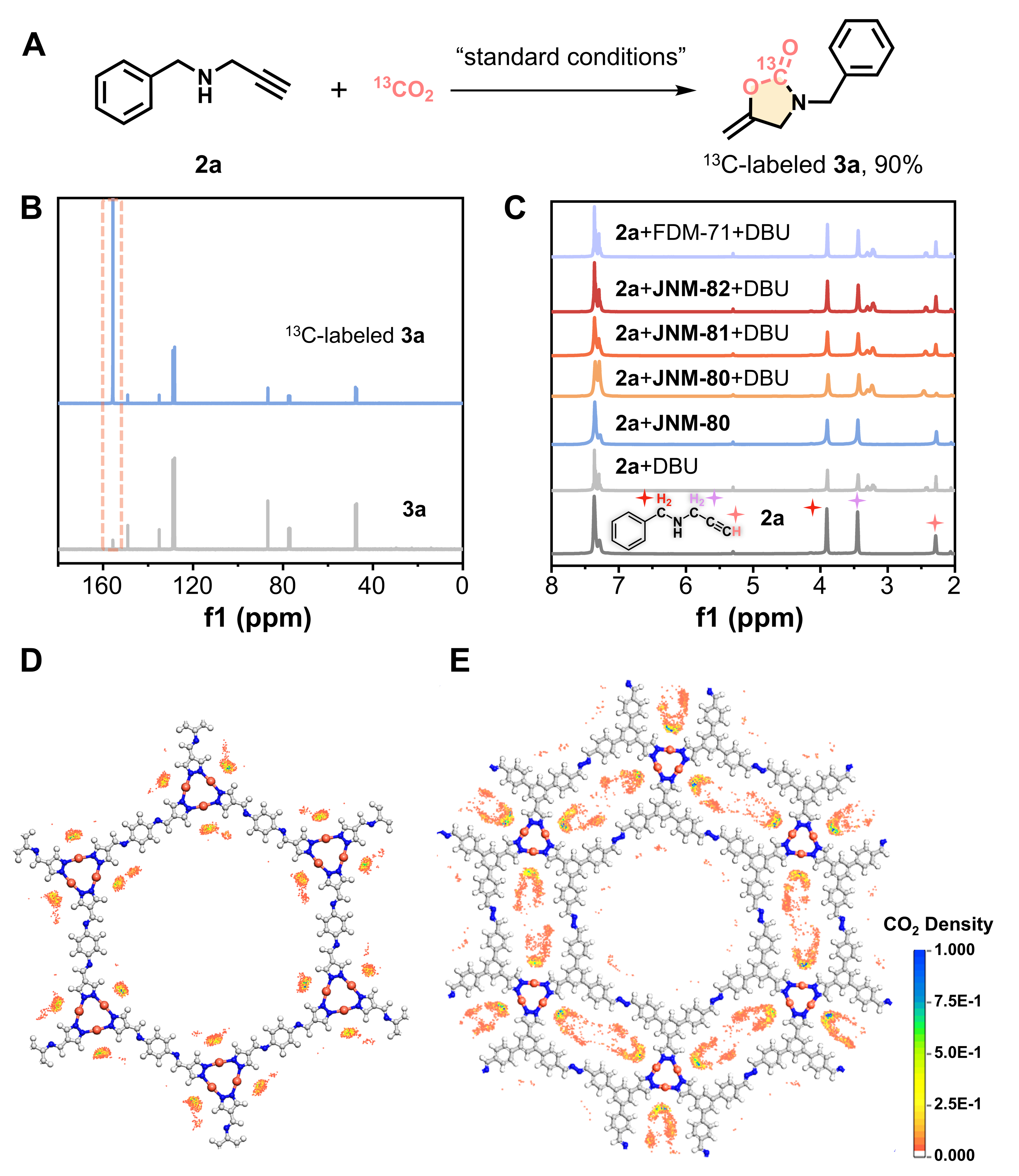 在之前的工作中,该课题组在构筑由一价铸币金属(即Cu、Ag和Au)环三核单元(CTUs)作为节点的二维(2D)CMOFs方面取得了巨大进展(CCS Chem., 2021, 3, 2045−2053;J. Am. Chem. Soc., 2022, 38, 17487–17495;Nat. Commun., 2022, 13, 7771;Angew. Chem. Int. Ed., 2023, 62, e202306497;J. Am. Chem. Soc., 2023, 41, 22720–22727;J. Am. Chem. Soc., 2024, 146, 19271−19278;Acc. Chem. Res., 2025, 58, 5, 746−761)。这类材料都是具有单一孔道的hcb结构。该研究提出了一种通过调控拓扑结构与孔径以增强MOF材料CO2捕获与转化性能的新策略。通过对吡唑配体进行修饰,成功将材料的拓扑结构从单一孔道的hcb拓扑转变为具有异孔的cpt网络。同时,通过调节二胺配体的长度,实现了对孔径的精细调控。与单孔材料相比,所制备的异孔CMOF展现出更优异的CO2吸附性能与更高的催化活性。值得注意的是,缩小孔径进一步增强了材料对CO2的作用,从而在多种CO2转化反应中显著提升了催化效率。在高湿度和模拟烟气条件下,该异孔CMOF仍能保持高催化活性。此外,该研究结合核磁共振波谱监测、同位素标记、巨正则蒙特卡洛模拟以及密度泛函理论计算,对反应机理进行了深入探究。机理表明其高性能源于异孔结构对CO2的富集与活化。
