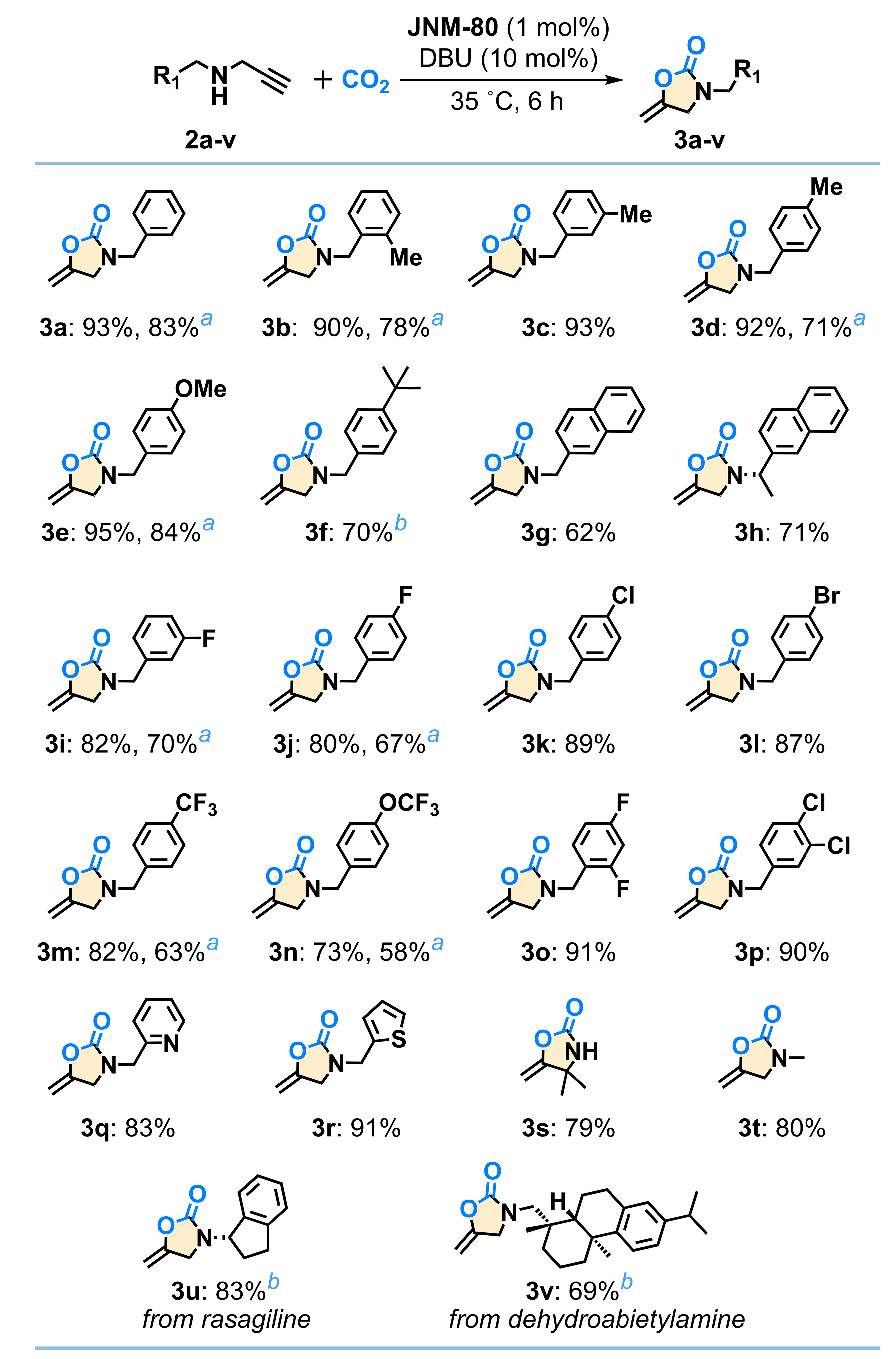 图4:炔丙胺与CO2环化反应底物范围。