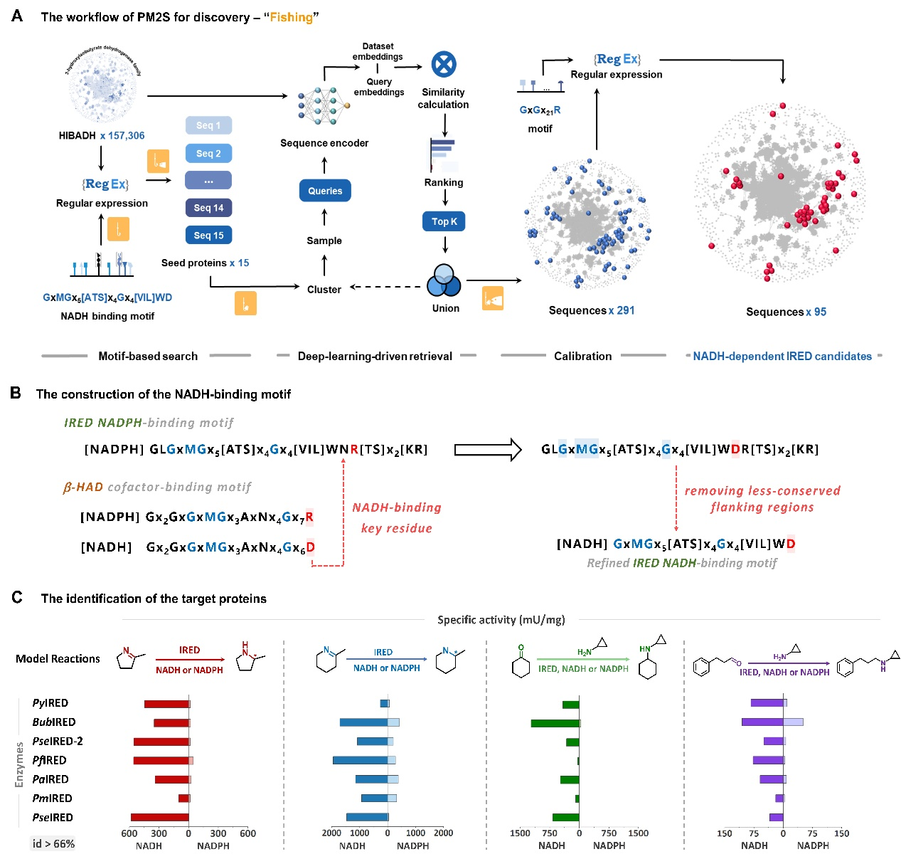 由于缺乏NADH依赖型亚胺还原酶的探针序列,传统依赖全序列比对的酶挖掘方法,无法实现对NADH依赖型亚胺还原酶的挖掘,成为制约新型亚胺还原酶发现的瓶颈。为突破这一难题,研究团队跳出传统全序列比对的思维框架,立足酶局部功能保守基序,开发出全新的PM2S(Protein Motif to Search)酶挖掘策略。