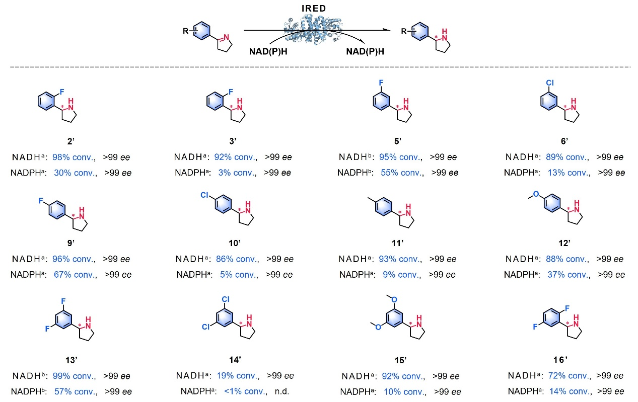 亚胺还原酶(IREDs)作为合成手性胺的重要生物催化剂,近年来已广泛应用于手性胺化学品的合成。然而,目前已报道的亚胺还原酶几乎均为NADPH依赖型,尚未见天然NADH依赖型亚胺还原酶的研究报道。