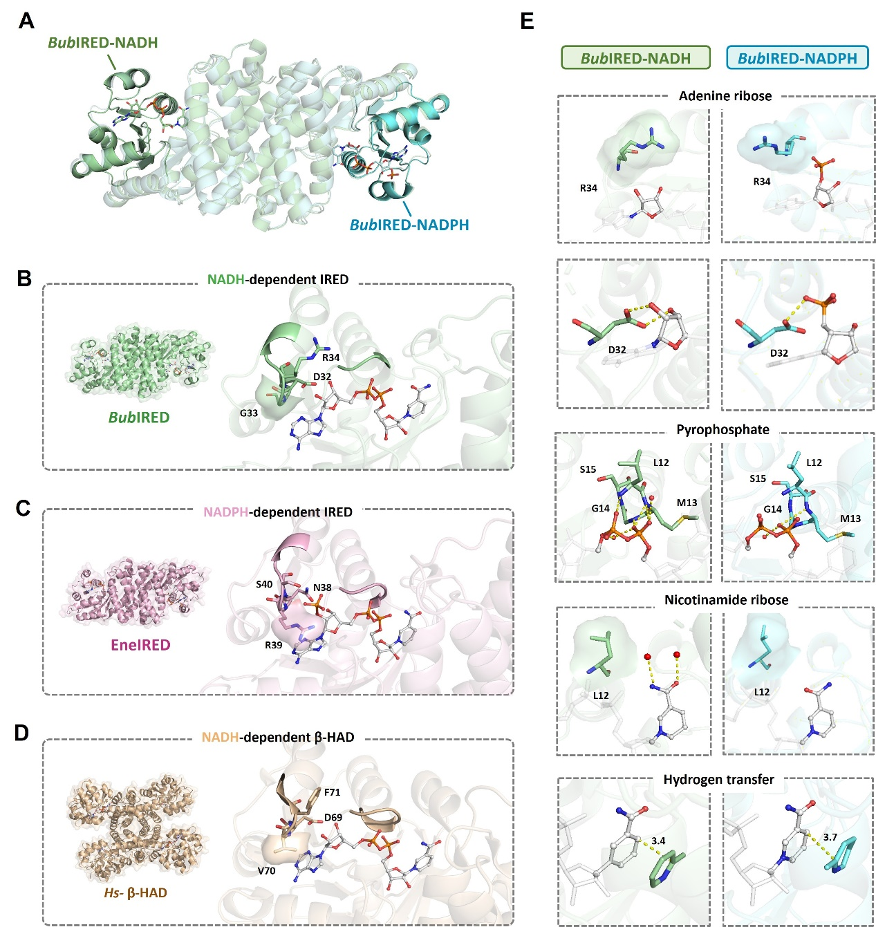 为揭示这类酶NADH偏好性的分子机制,该团队解析了酶-辅因子复合物结构,发现了辅因子结合口袋中的关键天冬氨酸(Asp)残基:该残基能与NADH形成稳定的空间和电荷相互作用,而NADPH的额外磷酸基团会因空间位阻和静电排斥难以结合。定点突变实验进一步证实,将该Asp残基突变为精氨酸(Arg)等带正电氨基酸后,酶的辅因子偏好性会彻底逆转,证实了该位点对辅因子选择性的决定性调控作用。