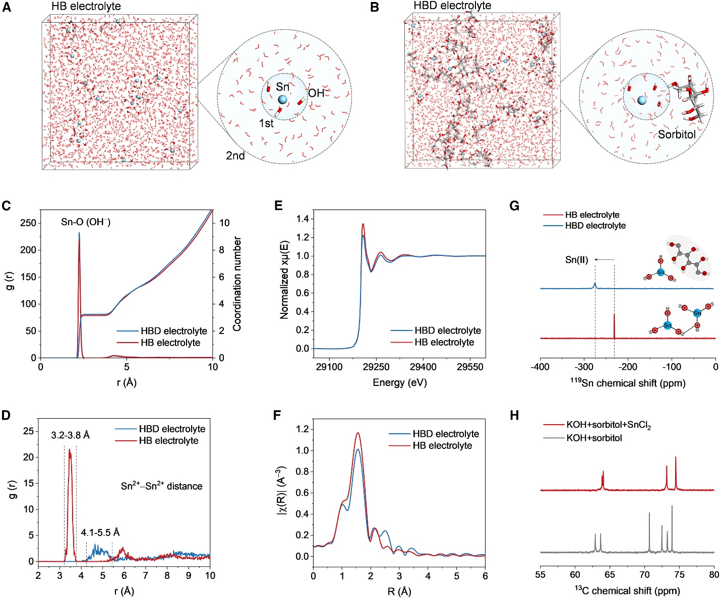 图4:溶剂化结构分析。(A–B)HB和HBD电解液的MD模拟快照。(C)Sn2+-OH–的径向分布函数及配位数。(D)Sn2+-Sn2+的径向分布函数。(E–F)Sn K-edge XAFS谱图及其R空间数据。(G)119Sn NMR谱图。(H)13C NMR谱图。