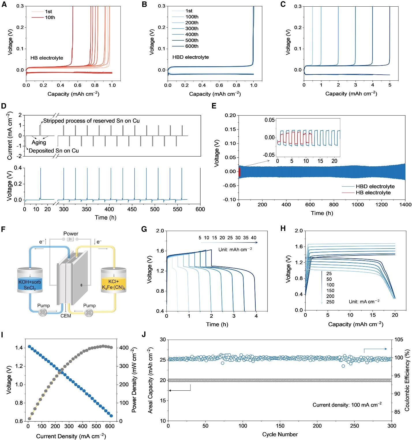 图2:电化学性能对比。(A–B) HB和HBD电解液在1 mA cm–2和1 mAh cm–2下的Sn沉积/剥离曲线。(C)不同面容量的HBD电解液在1 mA cm–2下的库伦效率。(D)老化对电极测试流程及相应的电压曲线。(E)对称Sn电池长期循环性能。(F)Sn//Fe液流电池的示意图。(G)不同面容量在20 mA cm–2下的恒流充放电曲线。(H)倍率性能。(I)Sn//Fe液流电池的极化曲线和功率曲线。(J)循环性能。