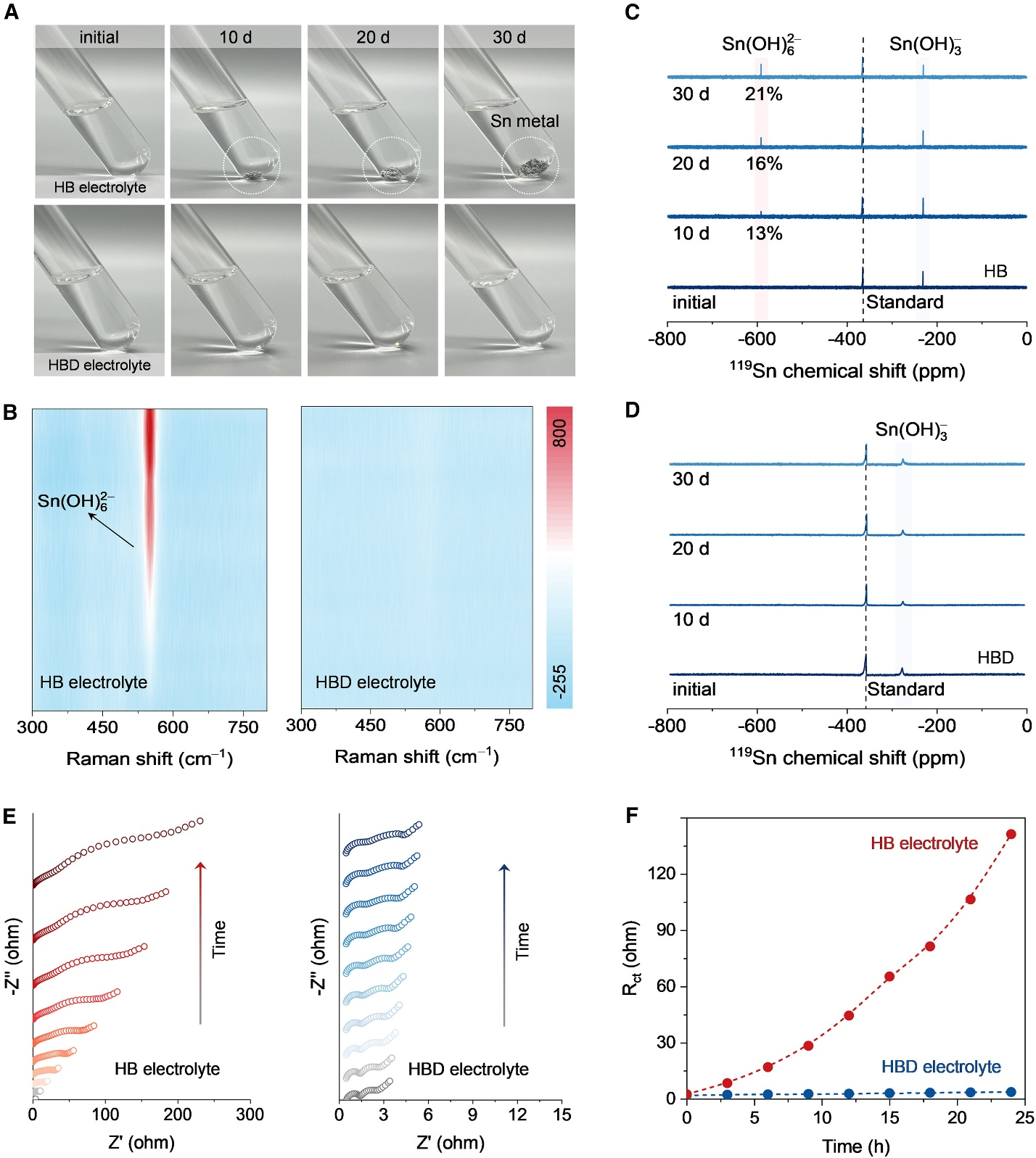 要点1:通过实验证实,在常规碱性电解液(HB)中,Sn(OH)3–会自发歧化生成Sn和Sn(OH)62–。原位拉曼和定量核磁共振(QNMR)清晰地追踪到这一过程,静置30天后,高达42%的Sn(II)发生歧化。这种副反应导致电荷转移电阻急剧增大,电化学性能迅速恶化。设计的HBD电解液,成功解决了歧化问题。
