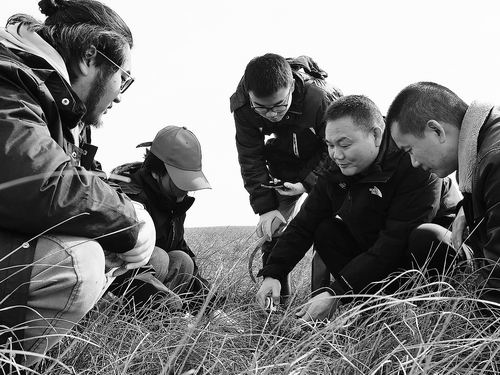 谢永宏(右二)和团队成员在芦苇丛中采样。