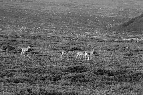 9月1日,新疆哈密,伊州区乌拉台乡天山山麓戈壁荒漠植被中成群结队觅食的国家二级重点保护动物鹅喉羚,个个膘肥体壮。