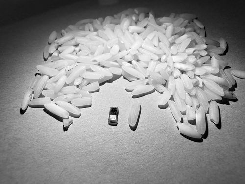 放在米粒旁边的微型起搏器。图片来源:美国西北大学