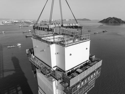 图为狮子洋大桥正进行索塔节段吊装作业。本报记者朱汉斌 通讯员何紫琪报道 冯珠仔/摄