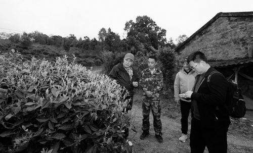 ④ 汪东风(右三)在牛孔镇茶园指导新茶采收工作。