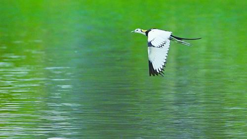水雉,鸻形目水雉科水雉属,又称水凤凰,其成鸟身长可达39至58厘米,尾羽长达25至35厘米,黑白分明的头部与亮黄色颈斑相映成趣,背部至尾部羽毛颜色从黑褐色至浅棕色不等,喜欢单独或成小群活动,因其对栖息地水质要求严苛,常被视为湿地生态系统的“环境质检员”。