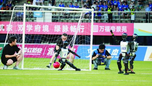 参赛人形机器人通过人工智能操控实现自主踢球,为场内外观众奉献了一场科技与竞技兼备的足球表演。图片来源:视觉中国