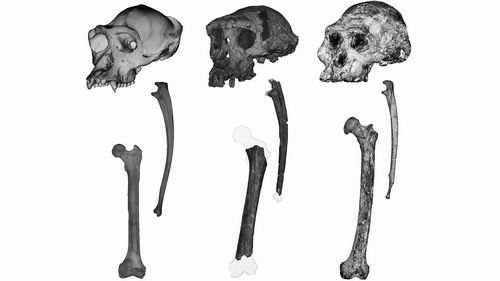 黑猩猩、撒海尔人乍得种、南方古猿(从左至右)的颅骨、尺骨和股骨。图片来源:Scott Williams