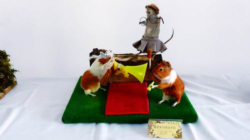 这次大赛不仅规模与规格创下历史新高,标本制作的新方法、新工艺也在参赛作品中得以充分展现,比如电脑生成并3D打印的白颈长尾雉仿真模型惟妙惟肖,UV滴胶(又称紫外固化胶)模拟的马来熊捕食时长舌头上的口水活灵活现。此外,还有不少“整活”类作品,比如拟人态的“狐先生”身着棕色衣服尽显优雅端庄,“鼠管家”与“清洁小队”各司其职打扫卫生……