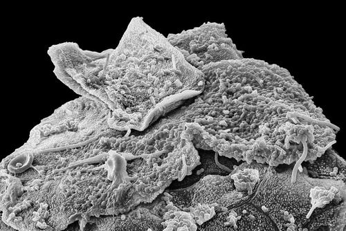 扫描电子显微镜下的人类口腔细菌与颊细胞。图片来源:STEVE GSCHMEISSNER