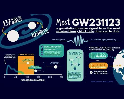 7月14日在英国苏格兰格拉斯哥举行的第24届国际广义相对论与引力大会(GR24)暨第16届爱德华多·阿马尔迪引力波会议上,国际合作团队——LIGO-Virgo-KAGRA合作组报告称,借助美国激光干涉引力波天文台(LIGO)等,探测到迄今最大质量黑洞合并事件。该成果对理解黑洞成长意义重大。