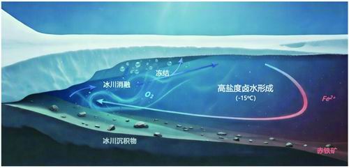 “雪球地球”时期冰架底部高盐度卤水池的形成及其中的铁氧化沉淀过程。中国科学院地质与地球物理研究所供图