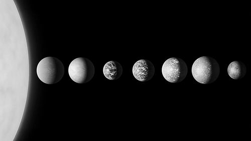艺术家笔下的特拉普派-1行星系统构想图,从左至右依次为特拉普派-1及a、b、c、d、e、f、g行星。其中,d、e、f、g行星被认为与地球最相似。图片来源:NASA/JPL-Caltech